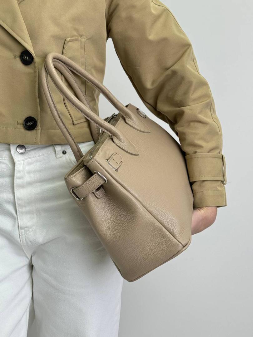 Бежевая женская сумочка в стильной подаче з зернистой итальянской кожи. Сумка имеет два основных отделения, которые разделяет карман на молнии. Внутри дополнительно есть карманы на молнии и открытые карманы для мелочей, что позволяет быстро находить необходимые предметы. Модель имеет крепкую серебристую фурнитуру. Длинные удобные ручки позволяют носить сумку в руках или на локте, что добавляет ей универсальности. Кроме того, в комплект входит ремень, который позволяет носить сумку на плече или через плечо, что очень удобно.