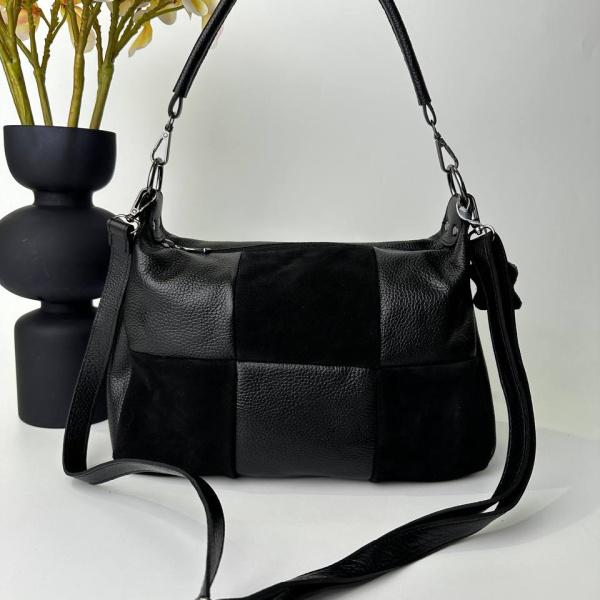 Удобный вариант кожаной сумки на каждый день, очень вместительная и практичная. Сумка из натуральной кожи флотар со вставками натуральной замш, благодаря этой модели Ваш образ станет неотразим. Внутри два основных отделения, также есть карман на молнии и без молнии. В комплекте два плечевых ремня.