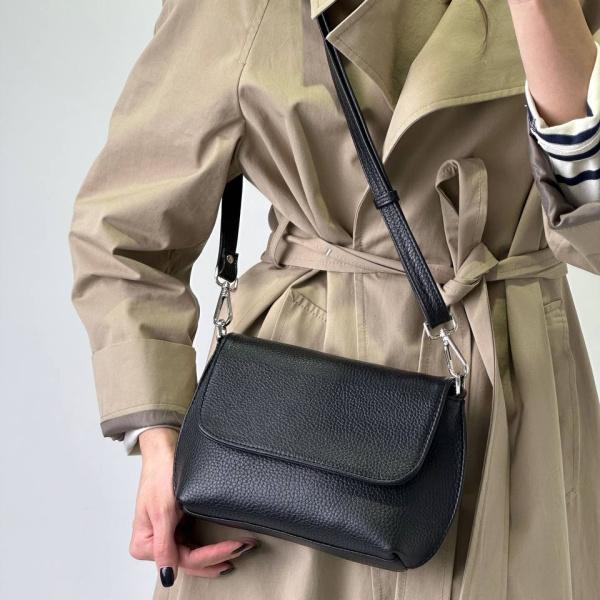Маленькая черная женская сумочка из натуральной зернистой кожи. Несмотря на свои размеры сумочка очень вместительная, одно отделения и дополнительные карманы, в комплекте длинный плечевой ремень.