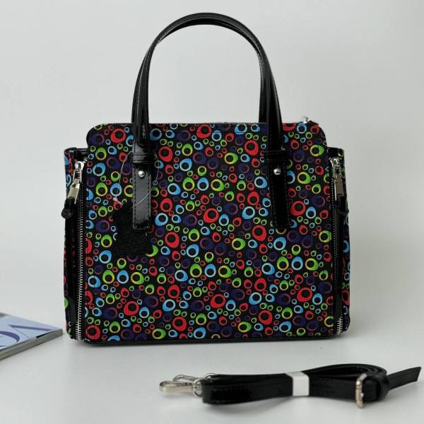 Очень интересная и необычная женская сумочка из очень приятной на ощупь натуральной кожи. С красивым вытеснением рисунка на самой коже. Сумочка имеет средний размер с двумя основными отделами. Так же есть карман по центру на молнии и два не больших кармана по бокам. Молнии со внешней стороны сумочки гармонично дополняют образ как декор. В комплект так же входит еще один кожаный ремешок, который регулируется.