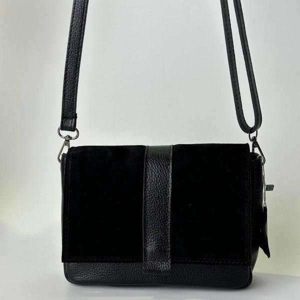 Удобная маленькая черная сумочка через плечо из натуральной кожи и вставки из натуральной замши. В сумке одно основное отделение, также есть маленький карман на молнии. Такая сумочка подойдет для любой стильной девушки на каждый день.