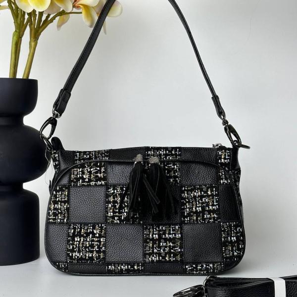 Сумка черная из натуральной кожи с яркими вставками под винтажный наряд. Сумка имеет три отделения и очень большое количество дополнительных карманом. Сумку можно носить как в руках так и через плечо, в комплекте два плечевых ремни, один из них регулируется под нужную вам длину. Сумочка подойдет любой моднице как на каждый день так и на особый случай.