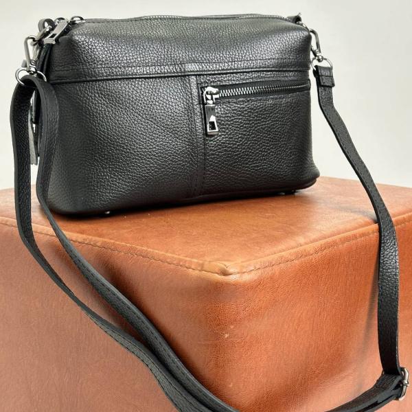 Маленькая, но очень вместительная женская сумочка из натуральной кожи черного цвета. Сумочка имеет два отдельных основных отделения, которые полностью закрываются на молнию. Внутри отделение есть карман на молнии и без молнии. Спереди и сзади сумочки также есть карманы на молнии, что очень удобно и практично. В комплекте идет стильный плечевой ремень, который регулируется под любую Вам длину. Она очень устойчивая за счет дополнительных ножек. Универсальный вариант сумочки, который подойдет абсолютно под все и на каждый день.