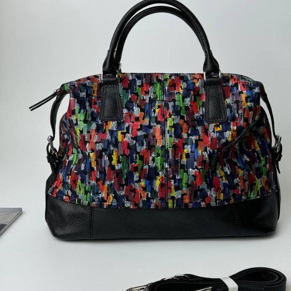 Разноцветная модель женской сумочки из натуральной итальянской кожи разукрасит ваш гардероб новыми красками. Сумка имеет два основных отделение, которые разделяет карман на молнии. Внутри есть дополнительные карманы на молнии и без, а также есть карман на молнии сзади. Ручки и дно сумки сделанные с натуральной кожи, а основная часть из замша. Низ сумки идет каркасный и в дополнение есть ножки, что придает эстетичного вида и возможность удерживать сумку не меняя ее замысла. В комплекте идет еще ремень, который легко регулируется под любую вам длину.