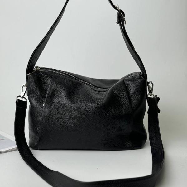 Красивая женская сумочка черного цвета из натуральной итальянской кожи. Сумочка очень комфортная ведь имеет два отдельных основных отделения, которые полностью закрываются на молнию. Внутри есть карманы на молнии и без, а также сзади сумки есть дополнительный карман на молнии. Для самых необходимых вещей, модель имеет спереди два вместительных кармана. Сумочка имеет два ремни - один короткий, а второй длинный. Легкая красивая модель, которая подойдет под любой образ.