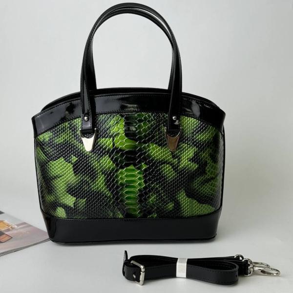 Лаковая женская сумочка из натуральной кожи с безумно красивым принтом. Очень эффектное сочетание черного и зеленого цветов. Даная модель аккуратная и держит свою форму. Внутри два отделение, которые разделяет карман на молнии. А также внутри есть карман на молнии и без. Для удобства сзади сумки есть карман на молнии. Модель имеет удобные ручки за которые сумку можно носить как в руке так и на руке. В комплекте идет еще ремень, который регулируется под любую вам длину. С этой моделью вы будете покорять сердца.