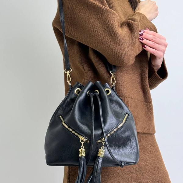 Купить черную женскую сумочку з натуральной зернистой кожи - отличное решение на каждый день или же мероприятие. Она добавить в ваш гардероб ярких красок. Ведь имеет слегка дерзкий стиль. Внутри сумочка имеет одно основное отделение, а также карман на молнии. Фурнитура в модели приятного золотистого цвета. Закрывается полностью на затяжки. Сумочку свободно можно носить так как вам угодно. Ремень регулируется под необходимую вам длину.