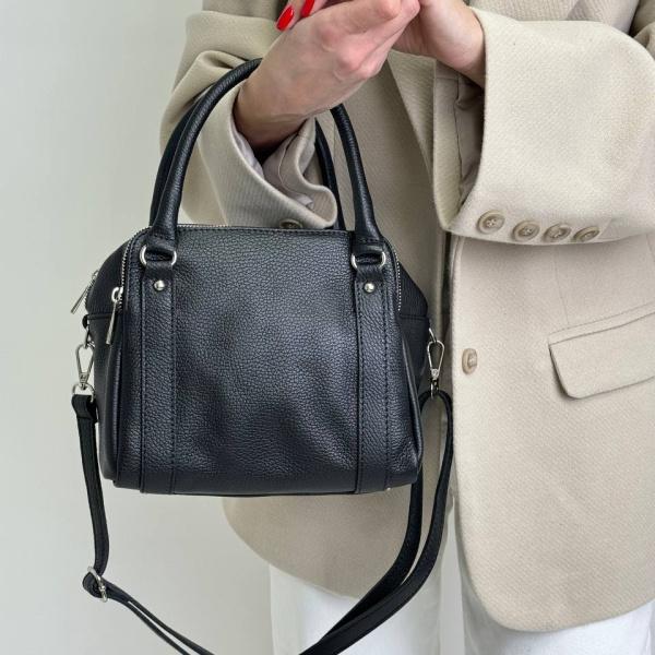 Черная женская сумочка пошита с натуральной зернистой кожи в черном цвете на каждый день. Внутри сумка имеет три отдельных отделения, которые закрываются полностью на молнии. Фурнитура крепкая серебристого цвета, что очень стильно смотрится. Модель можно легко носить в руках - ведь длинна и форма ручек удобно помещается в руке. А если хотите свободные руки, то дополнительно в комплекте есть ремень, что регулируется под нужную вам длину. Она станет неотъемлемой частью вашего гардероба.