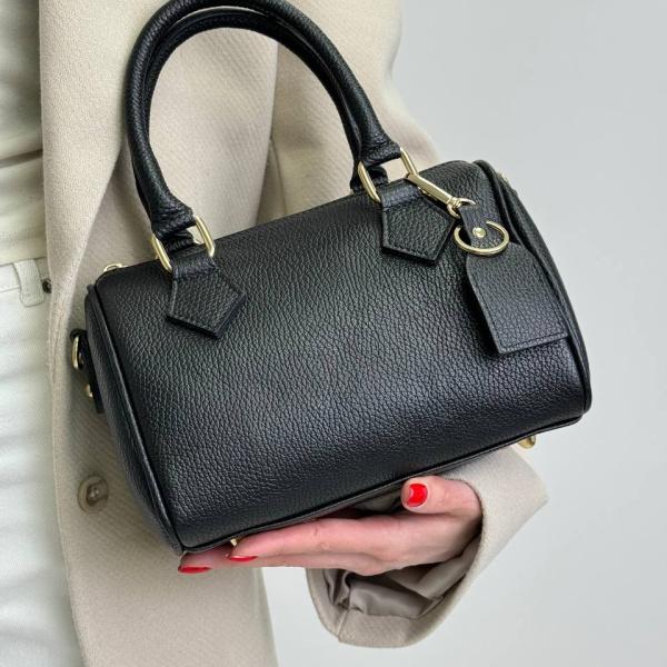 Купить женскую черную сумочку из натуральной кожи маленького размера на каждый день. Классический вариант сумочки из итальянской кожи в элегантном формате небольшого размера. Внутри сумочки одно отделения и дополнительный карман на молнии. Сумочка полностью закрывается на замок. Имеет удобные ручки и длинный ремень, который регулируется. Она отлично держит форму. Для более устойчивости модель имеет дополнительно ножки, которые защищают кожу от царапин снизу, что очень удобно.