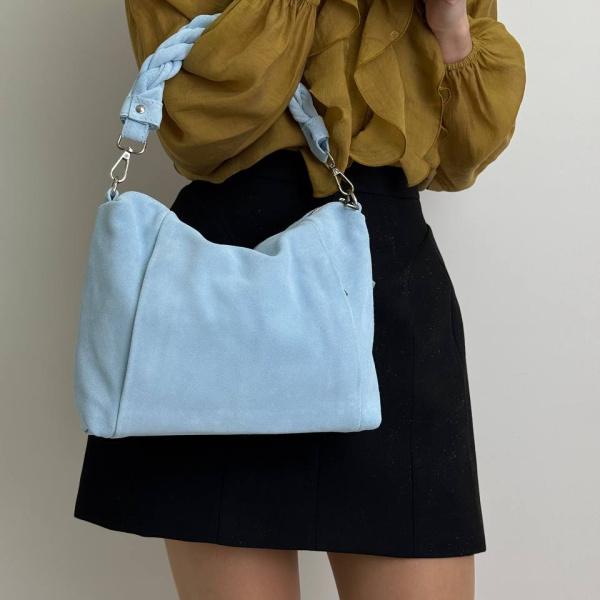 Сумка выполнена из качественной натуральной замши голубого цвета. Эта шикарная моделька не оставит Вас равнодушной. Внутри сумки одно основное отделение, также есть дополнительный карман на молнии и без, и дополнительные карманы на молнии боковые. В комплекте два плечевых ремни.
