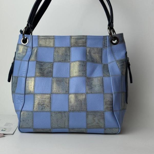 Сумка приятного голубого цвета из натуральной кожи. Внутри два основных отделения, которые разделяет карман на молнии. А также есть дополнительные карманы на молнии и без молнии, сумочка очень вместительная, также удобные ручки. Будь модной в этом сезоне.