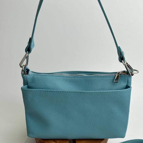 Представлена модель сумочки из натуральной кожи в сочном голубом цвете. Очень практичная и не большого размера. Имеется три отдела на молниях, одно основное и два боковых. Середина выполнена из качественного текстиля. В комплекте идет так же два ремешка: короткий на плече, и длинный ремешок через плече, который регулируется.