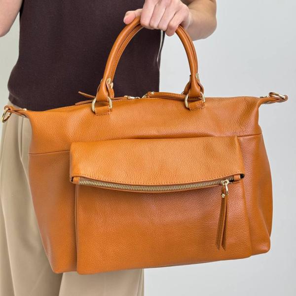 Карамельная сумочка из натуральной зернистой кожи. Сумка имеет удобные ручки, поэтому Вы можете носить ее в руке, а если нужны свободные руки - ее можно носить также и на плече, в комплекте плечевой ремень. Модель очень вместительная, подойдет как для рабочих поездок так и для офиса. Внутри сумки два основных отделения, также есть дополнительный карман на молнии и без молнии.