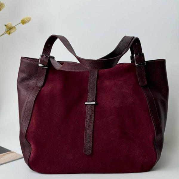 Большая женская сумочка с натуральной замши и зернистой кожи. Внутри два отделения, которые разделяет карман на молнии. А также есть дополнительные карманы на молнии и без. Сумку можно носить как в руках так и на плече, ремни регулируются под нужную вам длину.