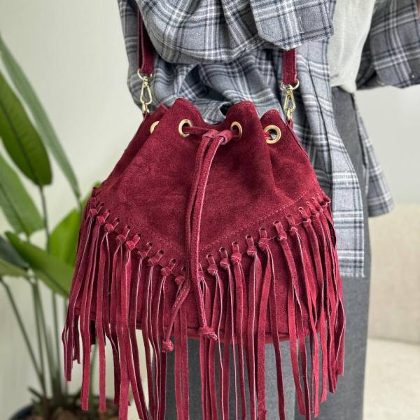 Новая женская сумочка из натуральной замши в эффектном цвете марсала. Модель имеет одно основное отделение внутри которого есть карман на молнии. Фурнитура крепкая золотистого цвета. Ее свободно можно носить как в руках так и на плече. Она неотменно предаст вам шарма и чувства стиля.