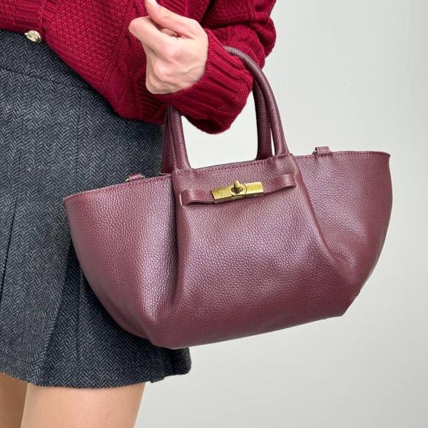 Комфортная и стильная модель в цвете марсала, которую можно носить в любую пору года. Модель имеет необычную форму, что привлекает внимания. Внутри сумочка имеет одно основное отделения, а также карманы на молнии и без. Для удобного ношения сумочка имеет закругленные ручки и дополнительно ремень, который регулируется. Полностью сумка закрывается на молнию.