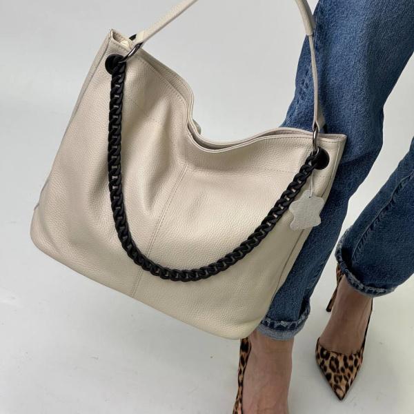 Сумочка из натуральной кожи флотар в молочном цвете. Добавь к своему стилю немного характера на каждый день. Внутри два основных отделения, карман перегородка на молнии, также есть дополнительные карманы на молнии и без, сумочка очень вместительная, также удобная ручка на плече. Будь модной в этом сезоне.