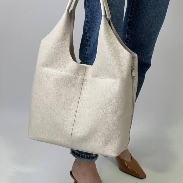 Новинка! Фактурная молочная сумочка из натуральной кожи. Имеет два основных отдела и три внутренних кармана. Сзади имеется так же карман на молнии. Станет отличным дополнением для прогулок.