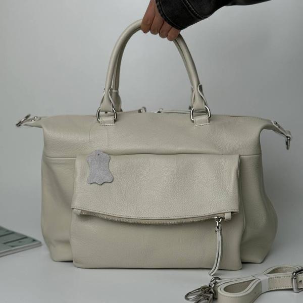 Большая женская сумочка молочного цвета, которая непременно доставить вам удовольствие в ношение. Сумка имеет удобные ручки, поэтому Вы можете носить ее в руке, а если нужны свободные руки - ее можно носить также и на плече, в комплекте плечевой ремень. Модель очень вместительная, подойдет как для рабочих поездок так и для офиса. Внутри сумки два основных отделения, также есть дополнительный карман на молнии и без молнии.