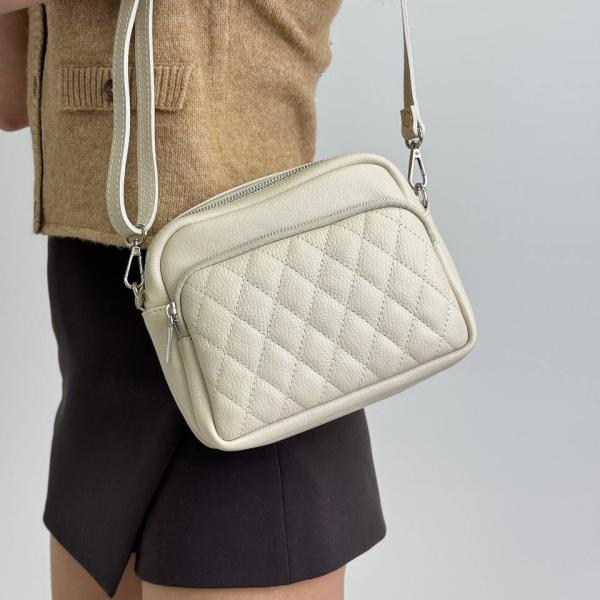 Женская сумочка в молочном цвете идеально подойдет на каждый день. Полностью модель выполнена из натуральной приятной на ощупь кожи. Имеет модель два отдельных отделения на замке. Дополнительные карманы на молнии и без. Она практична и подойдет под любой образ. А для удобного ношения есть ремень, который регулируется под нужно вам длину.