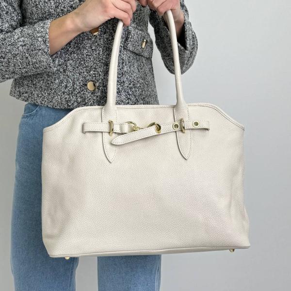 Купить вместительную женскую сумочку из натуральной кожи в нежном молочном цвете - это идеальный вариант красивого аксессуара на каждый день или же командировок. Внутри сумки большое одно отделения и дополнительные карманы на молнии и без. Фурнитура притягательного золотистого цвета. Сумочка практичная в ношении - ведь у нее достаточный длинны закругленные ручки, которые разрешают носить сумку в руках и на руке. А для свободных рук дополнительно в комплекте идет ремень, он разрешает носить сумку и через плечо.