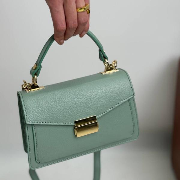 Эта маленькая сумочка приятного мятного цвета из итальянской кожи со золотистой фурнитурой идеально подходит для тех, кто ценит элегантность и практичность. Она компактна и вместительна благодаря основному отделению и дополнительному карману без молнии. Удобная ручка и регулируемый ремень делают её удобной в ношении. Особенность ее в том, что внутри нет подкладки, а полностью кожа. Она закрывается на застежку, обеспечивая безопасность хранения.