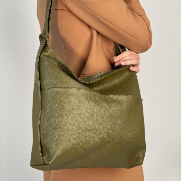 Новинка, сумка из мягкой натуральной кожи в цвете оливка, это тренд сезона. Под клапаном одно отделения которые закрываются на молнию, также есть дополнительный карман на молнии и без. Сумочку можно носить через плечо, очень практична и удобная модель.