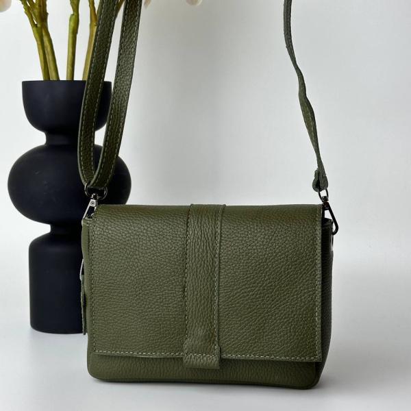 Модная маленькая сумочка через плечо из натуральной кожи в цвете оливка. В сумке одно основное отделение, также есть маленький карман на молнии. Такая сумочка подойдет для любой стильной девушки на каждый день.