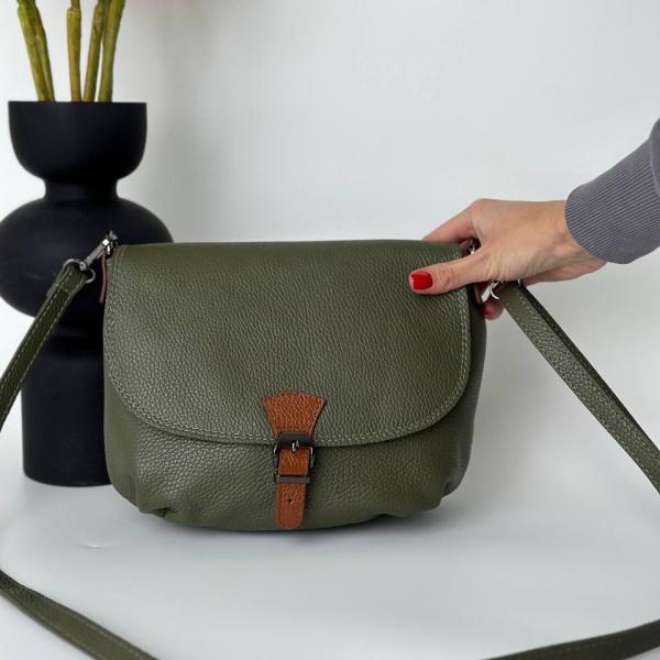 Женская сумка из натуральной зернистой кожи оливкового цвета. Очень приятная и мягкая на ощупь кожа. Внутри одно основное отделения. Есть дополнительные карманы на молнии и без. А также есть ремень, который регулируется. Закрывается сумочка на клапан на магнитной кнопке. Необычная и красивая ее форма дополняется максимальным удобством в ношении. Она будет радовать вас каждый день.