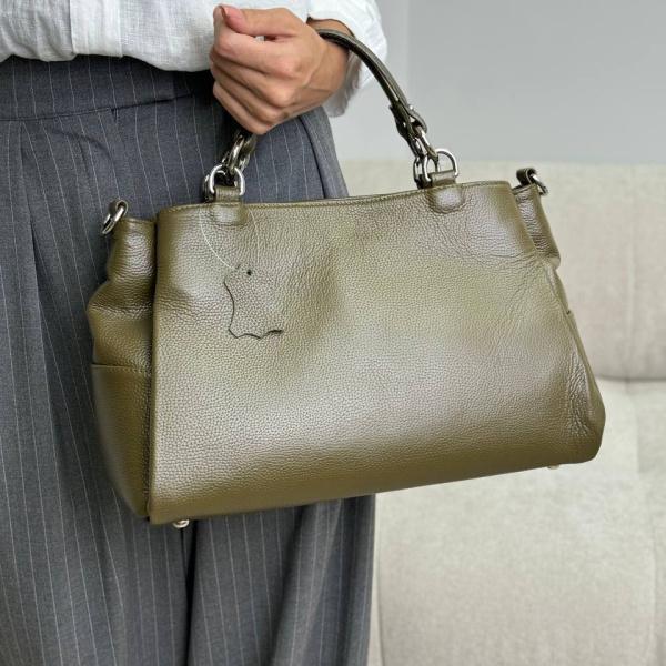 Оливковая сумочка из натуральной итальянской кожи среднего размера. Универсальная модель, которая имеет три отдельных основных отделения. Они полностью закрываются на молнию. Внутри и сзади есть дополнительные карманы на молнии и без. Сумочку можно носить как в руках так на плече и через него. С ней ты будешь все необходимое иметь под рукой.