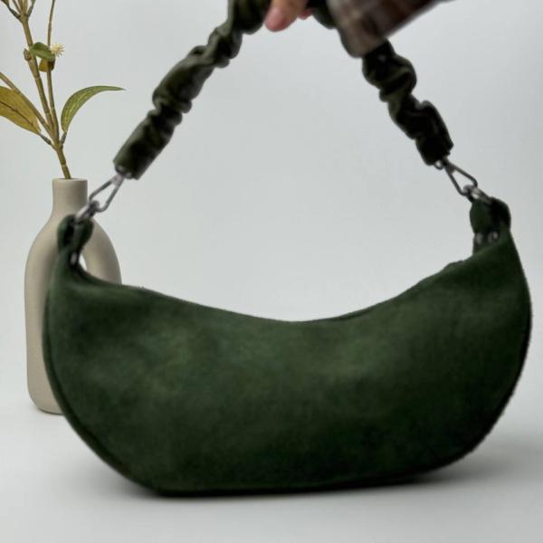 Легкая и гармоничная оливка сумочка из натуральной замши. Сумочка имеет очень приятную на ощупь замшу. Внутри сумки одно вместительное отделение. Также внутри есть отдельный карман на молнии, что очень удобно. Сумка полностью закрывается на замок. Ручка выполнена из зернистой кожи, что очень практично. Дополнительно в комплект входит длинный кожаный ремень, позволяющий носить её как через плечо, так и в руках, делая модель универсальной для повседневной жизни или вечерних выходов.