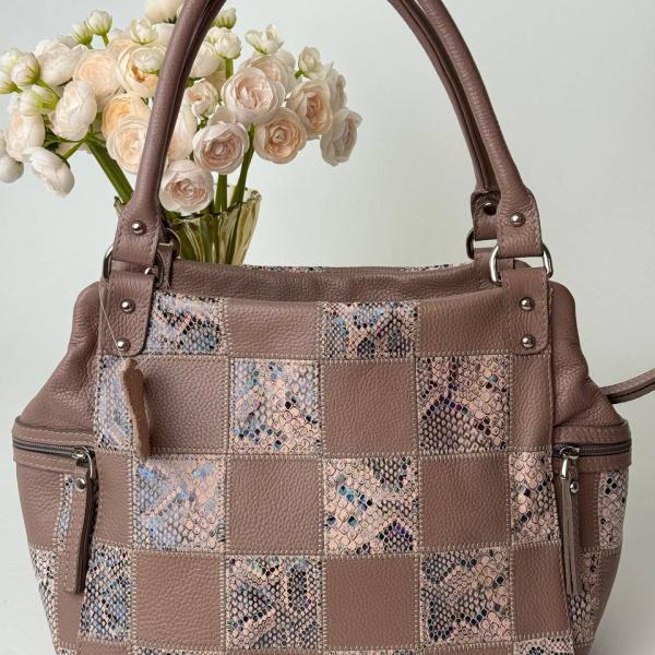 Модная сумочка из натуральной кожи в легком пудровом цвете. Сумка имеет три отделения которые закрываются на молнию, одно основное и два дополнительных боковых на молнии, также есть удобные маленькие боковые карманы на молнии. Она поместить в себе абсолютно все.