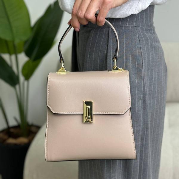 Купить женскую сумочку маленькую в очень нежном пудровом цвете, это прекрасный вариант преобразить ваш образ в легкою невинность. Внутри модель имеет одно основное отделение, а также карман на молнии. Сумочка имеет необычную форму,но очень удобную. Она особенна тем, что внутри она также кожаная. Это придает ей более красивого внешного вида и стойкого ношения. Фурнитура подчеркивает ее красоту своим золотистым оттенком. Закрывается модель полностью на клапан с необычным магнитным замком. Модель свободно можно носить за ручку и дополнительно есть ремень, который регулируется под необходимую вам длину. Укрась свой образ прекрасным.