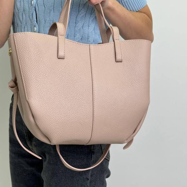 Необычная форма, полностью натуральная кожа, вместительная и очень красивая модель - это именно о нашей новой модели. Сумочка выполнена в нежном пудровом цвете. Внутри одно основное отделение, а также клатч, который можно свободно достать с сумки. Его же можно использовать и как небольшую косметичку. Есть ручки, одни длинные, что разрешают носить сумку на плече, и короткие ручки за которые сумочку можно носить в руках. Вы будете неотразимой вместе с ней.