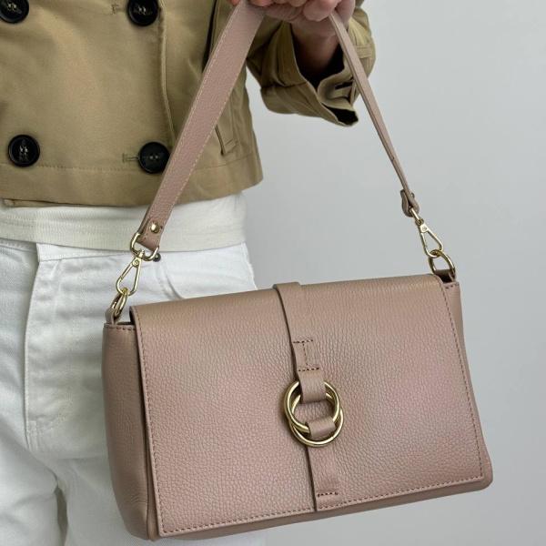 Очень нежная женская сумочка в пудровом цвете из зернистой кожи с золотистой фурнитурой станет идеальным аксессуаром для любого образа и на каждый день. Сумочка небольшого размера, внутри имеет одно основное отделение и карман на молнии для удобного хранения мелочей. Сзади расположен дополнительный карман на молнии для быстрого доступа к важным вещам. Сумка закрывается надежным замком и дополнительно клапаном на магнитной кнопке. В комплекте два ремня: короткий для носки в руке и длинный для удобства на плече, он свободно регулируется и разрешает носить сумку как вам удобно.