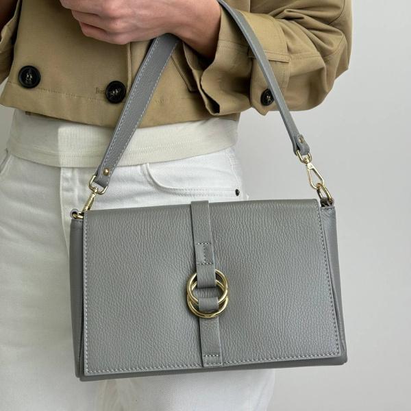 Элегантная женская сумка из натуральной кожи с золотистой фурнитурой станет идеальным аксессуаром для любого образа. Представлена сумочка в красивом стильной сером цвете. Модель небольшого размера, внутри имеет одно основное отделение и карман на молнии для удобного хранения мелочей. Сзади расположен дополнительный карман на молнии для быстрого доступа к важным вещам. Сумка закрывается надежным замком и дополнительно клапаном на магнитной кнопке. В комплекте два ремня: короткий для носки в руке и длинный для удобства на плече.