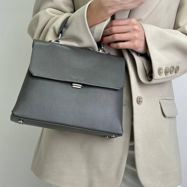 Наш незаменимый аксессуар на все случаи жизни - новая сумочка из натуральной зернистой кожи в сером цвете. Она обладает вместительным дизайном с двумя основными отделениями, что позволяет удобно организовать все необходимые вещи. Внутри предусмотрены карманы: один на молнии и один без молнии для мелочей, которые должны быть под рукой. Сумка закрывается полностью на клапан на замке, он обеспечивает надежность и безопасность ваших вещей. Модель также оснащена удобной ручкой и регулируемым ремнем, что позволяет носить сумочку как в руке, так и на плече.