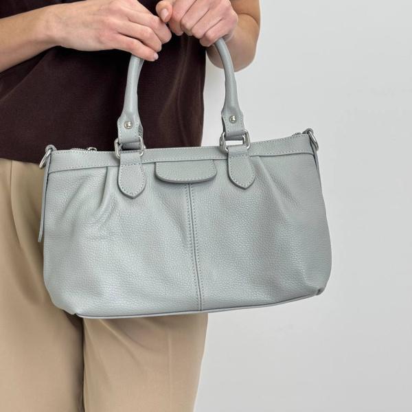 Вместительная женская сумочка серого цвета идеально дополнит ваш образ и сделает его более утонченным. Она имеет красивую удобную форму. Внутри есть одно полноценное отделение и дополнительные карманы на молнии и без. Сзади сумочки есть дополнительный карман на молнии, что очень удобно. Сумочку можно носить в руках за ручки или же на плече на дополнительном ремне.
