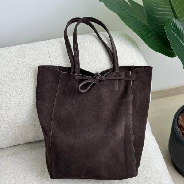 Мягкая сумочка из натуральной замши в красивом шоколадном цвете, которую можно стилизовать с вашими необычными образами. Сумка имеет удобные ручки, поэтому Вы можете носить ее в руке, а если нужны свободные руки - ее можно носить также и на плече. Внутри сумки одно основное отделения, также есть дополнительный карман на молнии.