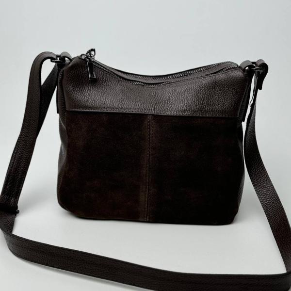 Женская сумочка на два основных и очень вместительных отделениях на каждый день. Сумочка очень практичная и красивая. Она совмещает в себе натуральный замш и зернистую кожу, это придает ей некой изюминки. Очень вместительная моделька, отделения полностью закрываются на молнию, внутри есть дополнительные карманы. Длинный плечевой ремень в комплекте, регулируется под нужную вам длину.