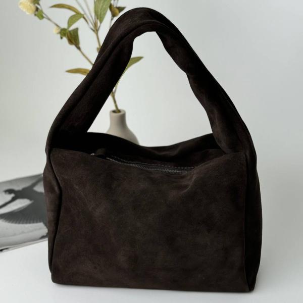 Шоколадная женская сумочка из натуральной замши, которая дополнит ваш лук своей эффектностью. Модель имеет оригинальную форму и большая по вместительности. Один просторный отдел и удобные карманы обеспечивают практичность и комфорт. Побалуйте себя новой сумочкой и покори этот мир своей стильностью.