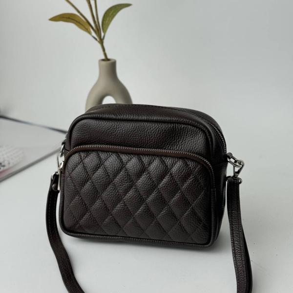 Женская сумочка из натуральной итальянской кожи небольшого размера. Она небольшая, но вместительная. Она подойдет под любой ваш наряд и дополнит его. Имеется два отдела на молниях, одно основное и одно боковое. Середина выполнена из качественного текстиля. В комплекте идет ремень, который регулируется.