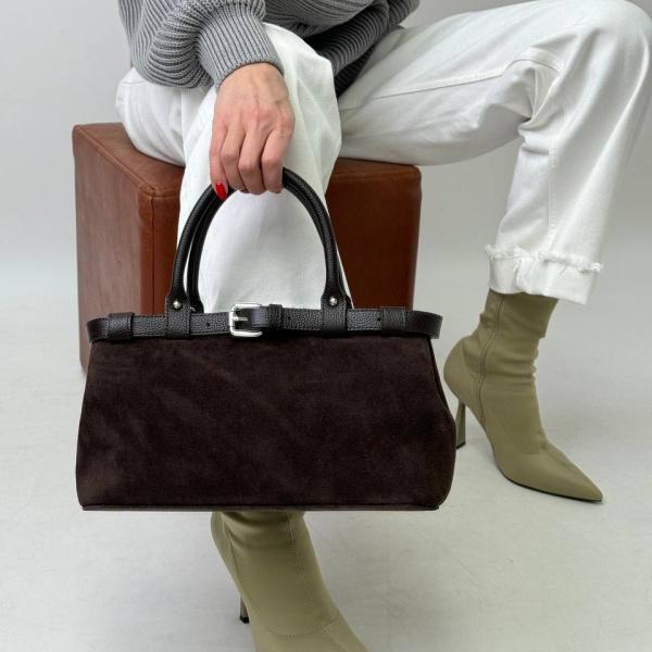 Сумочка имеющую притягательную красоту и энергетику. Выполнена наша новая модель из натуральной замши в соединении натуральной зернистой кожей. Она очень удобная, держит форму. Внутри два просторных отделения и карман перегородка на замке. Также есть дополнительные карманы на молнии и без, что удобно хранить вещи в порядке. Сумочка имеет закругленные ручки. Их удобно носить в руках или же на руке. А еще дополнительно идет кожаный ремень, который регулируется. Она стильная, эффектная и очень приятная модель как на ощупь так и в ношении.