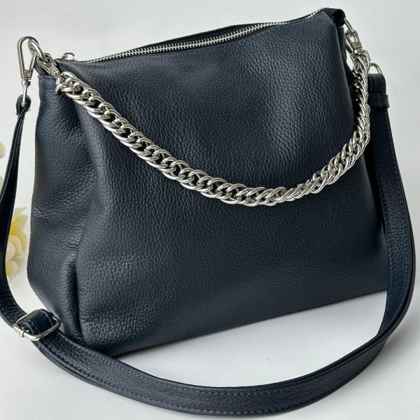 Синяя женская сумка из натуральной кожи. Сумка имеет три очень вместительные отделения. Среднее отделение отдельно закрывается на замке, а также внутри сумки есть карманы на молнии и без. Сама сумка закрывается полностью на замок. Сзади имеется широкий карман, который также закрывается. В дополнение идет ремень, который можно отрегулировать под любую для вас длину или сделать его двойным, что очень удобно. Он очень легко снимается. Особенность данной модели в том, что она имеет грубую и крепкую, но очень красивую, серебреного цвета цепочку. Который можно использовать как украшение или как сам ремень. Сумочка подойдет на каждый день и под любой стиль.