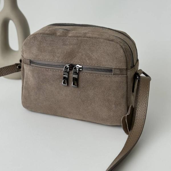 Маленькая женская сумочка из натуральной кожи и замши. Она очень уникальна тем что, она полностью замшевая и лишь сзади сумки зернистая кожа. Это делает ее более легкой и удобной в ношении. Внутри сумки два отделения, также есть дополнительные карманы на молнии и без. Сумочку свободно можно носить как на плече так и через плечо.