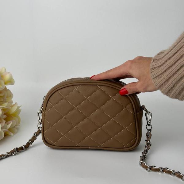 Маленькая, очень удобная женская сумочка из натуральной кожи в красивом цвете тауп. В сумке одно основное отделение, также есть дополнительный маленький карман. А еще есть необычный ремень, длина которого разрешает носить сумку как на плече, так и через плечо. Особенность ремня в том, что он из натурной кожи с переплетом цепи серебристого цвета. Такая сумочка подойдет для любой стильной девушки на каждый день или особое мероприятие.