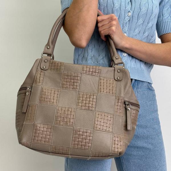 Вместительная женская сумочка в красивом соединение цветов. Сумка имеет три отделения которые закрываются на молнию, одно основное и два дополнительных боковых на молнии, также есть удобные маленькие боковые карманы на молнии. Она хороша в ношение и подчеркнет каждый ваш образ.