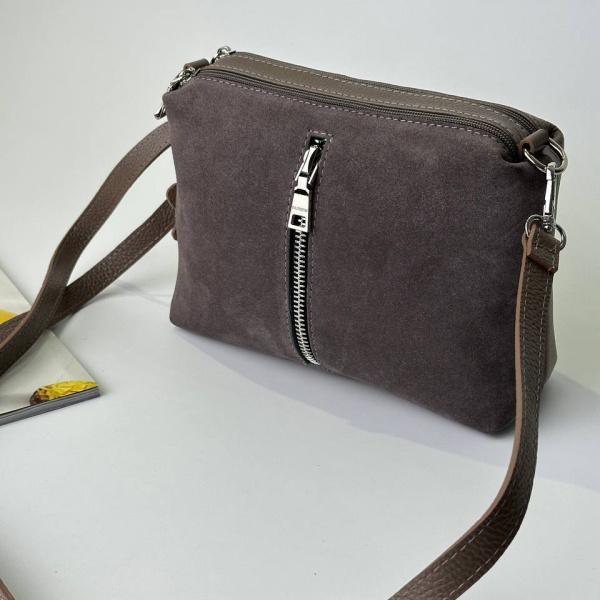 Маленькая сумка из натуральной кожи и замши, будет радовать вас каждый день. Внутри одно основное отделения, также есть дополнительный карман на молнии и без молнии. Подойдет как на прогулку так и на каждый день.