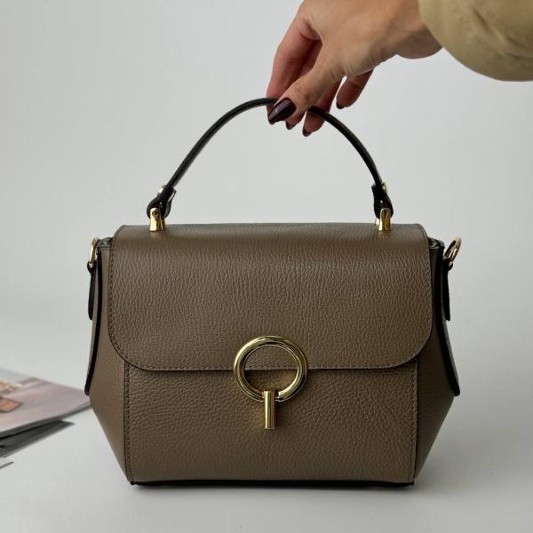 Женская сумочка из итальянской кожи, которая подойдет на каждый день. Выполнена з зернистой кожи в приятном цвете тауп. Сумочка имеет очень необычную, но уникальную форму. Внутри два основных отделения. А также есть карманы на молнии и без. Фурнитура золотистого цвета. Сумочку можно свободно носить как за ручку так и за ремень, который свободно регулируется. Будь стильной с нашей красоткой.