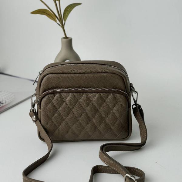 Женская сумочка в цвете тауп на каждый день. Полностью модель выполнена из натуральной приятной на ощупь кожи. Имеет модель два отдельных отделения на замке. Дополнительные карманы на молнии и без. Она практична и подойдет под любой образ. А для удобного ношения есть ремень, который регулируется под нужно вам длину.